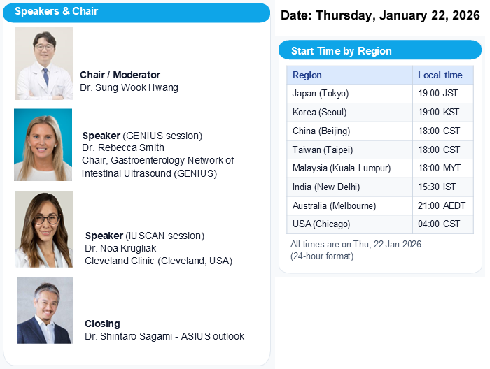 The AOCC Educational Committee cordially invites you to the AOCC IUS Primer 2023: Multimodal Use of Intestinal Ultrasound in Crohn’s Disease – From Diagnosis to Follow-Up Webinar that is scheduled on Tuesday, 25 July 2023 | 18:00–19:00 (GMT +8).